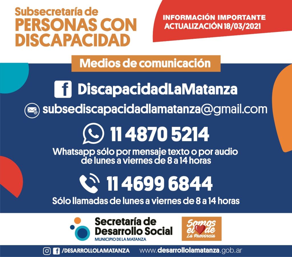 Los vecinos podrán comunicarse de lunes a viernes de 8 a 14 Hs. a través de los siguientes medios de contacto: por teléfono al 4699-6844, a través de mensaje de WhatsApp 11-4870-5214 (no se aceptan llamadas a este número) o vía mail a subsediscapacidadlamatanza@gmail.com. Además, la Subsecretaría cuenta con su propia cuenta de Facebook: @DiscapacidadLaMatanza y Instagram: @subsediscapacidadlamatanza.