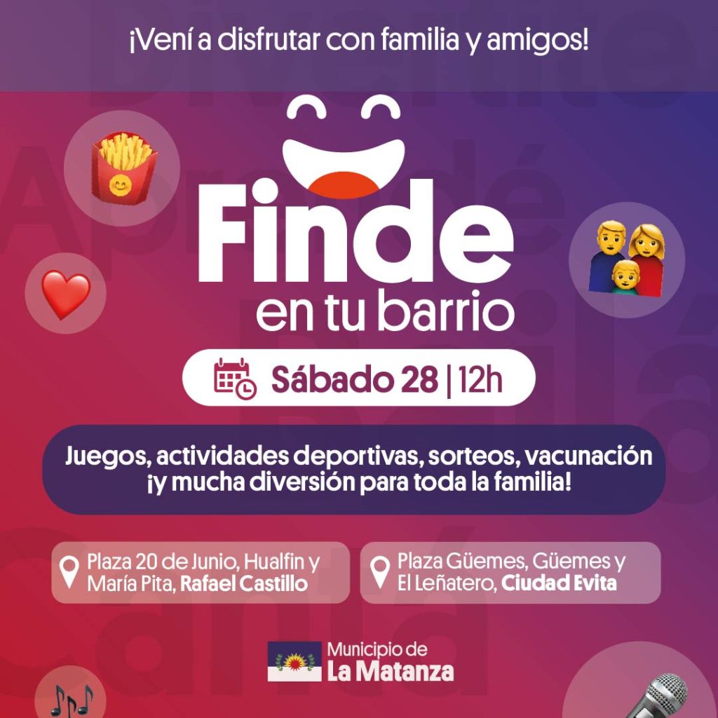 Este sábado 28 de septiembre, llega Finde en tu barrio a las localidades de Rafael Castillo y Ciudad Evita. El objetivo es transformar las plazas en espacios de encuentro, ofreciendo actividades deportivas y recreativas al aire libre, con la participación de artistas locales, música en vivo, danza, sorteos y mucho más para disfrutar en familia.