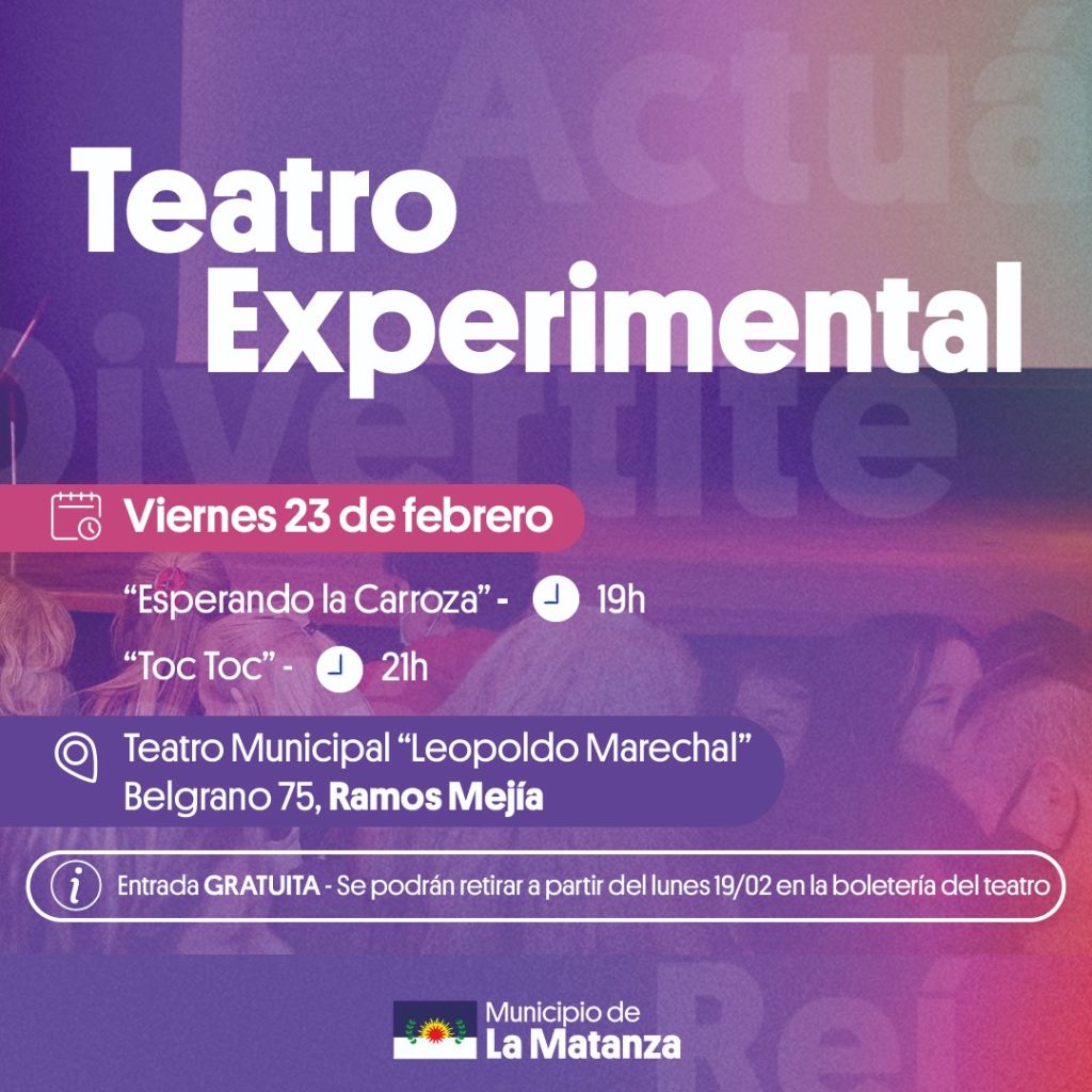 En el marco de la apertura de su Agenda Cultural 2024, el Municipio de La Matanza, a través de la Secretaría de Cultura y Educación, presenta una nueva edición del ciclo Teatro Experimental , que en esta oportunidad, será de la mano del “Club de Teatro Tercer Piso”, escuela de teatro dirigida por Leo Spina, que presentará su versión libre de dos clásicos: “Esperando la Carroza” y “Toc Toc”.